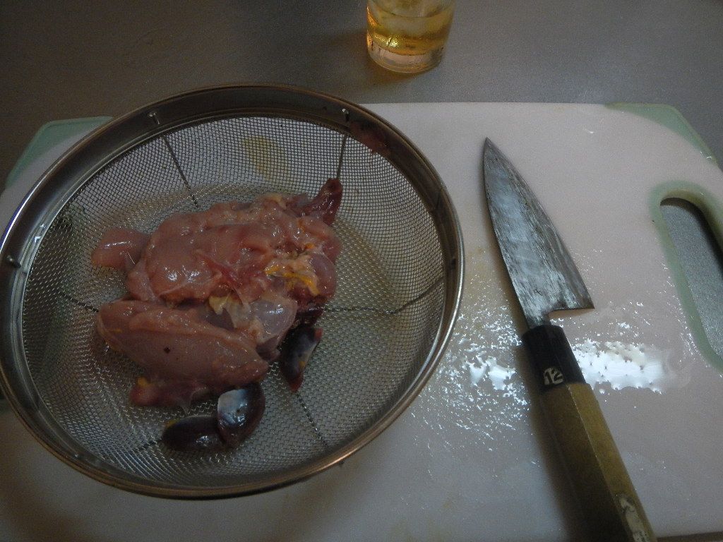 本日の夕方に、射獲したコジュケイの羽をむしり、食べやすいように肉をばらし、白さんにいただいたスズキもこけらを落として、刺身とムニエルに食べられように3枚におろし、コジュケイの肉と共に冷蔵庫に保存します。