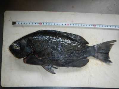 夜釣り本番時間に飛距離は出せず当たりもなく、仕方なく諦め半分で4~50メートルの近場を流してみると、カゴがボボボ-と沈む初めての良い当たり、今回の釣果は写真のメジナ一枚の貧果でした。