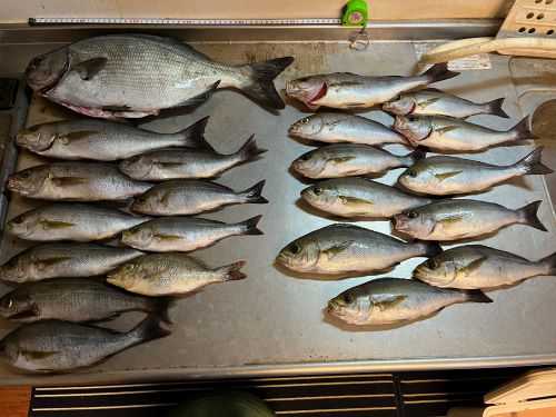 写真左が50㎝のイスズミと33㎝頭イサキの私の釣り果、右が32㎝頭イサキの弟の釣り果です。