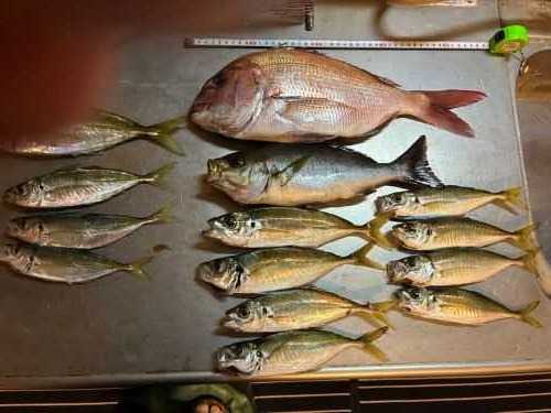 前回カゴ釣りに続き、弟が連続の45㎝の真鯛ゲットに35㎝のイサキにアジ8匹含む10枚の大漁。