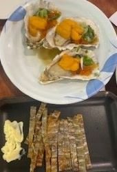 前回このお店に来たのが昨年3月だった事を思い出させてくれた一品が福岡県博多湾で養殖されている生牡蠣で今年もこの時期1週間限定でメニューにあり、今回はウニといくらと生牡蠣和えの贅沢な一品を選び「ほまれ~」との相性は至福でした。