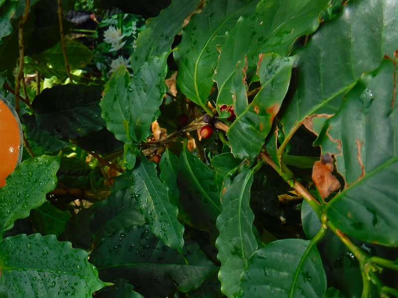 リベリアコーヒーノキが1本、実が生っておりましたよ。他のロブスターやアラビア、別のリベリアコーヒーノキにはまだ花も咲いて無かったみたいなんですけどね。