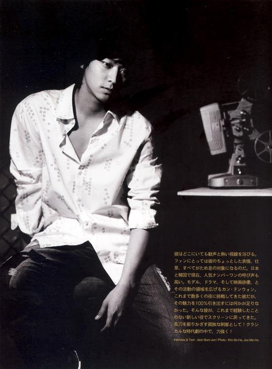 彼には相反したイメージが存在する.柔らかさと強さ不協和音みたいなこの妙な魅力はわずかこの間までにしても ‘花美男’という修飾語後に止められたまま隠されていた.したがって今そののっぺりしている修飾語は折らなければならない.今この瞬間から彼は TVとスクリーンの上できらめくでしょう.泣いて笑って声を出しながら応じて動く俳優 ‘江東院’で.これミサイルも出るのか?” 彼が初めて声を出した CF.彼が知る幾多のファッションエディタたちは空中波に乗ってただ何秒間流れ出た嬉しい声に沸き返えた.シムドロングした一言であるだけだったが,その間地面上では表現することができなくて惜しいだけだったその隠された魅力のとても小さな光がいよいよ狭い隙間で漏れたあと巻いたような感じ,大事な何かを見付かってしまったような感じだと言おうか.どもる慶尚道なまりがまだ舌先にこっそりついていたりしたが,カジッゴッ気に止めないというようぱんと吐き出す彼の声はやっとはじめて ‘江東院’という存在感を近く感じるようにしてくれた.江東院という人よりは増える ‘音ない’ 可愛らしいイメージのモデルでばかりした彼.そのやっぱりいつまでもそんな点が息苦しかったことだろう?しばらく彼のスケジュールノートをいっぱい満たした画譜撮影代わり,スクリーンと映画デビューを控えた延期演習とドラマ撮影スケジュールでチェウォがである.おかげさまでインタビュースケジュール取ることがつとに当惑だった位.去年末画譜撮影時見た以後で久しぶりにスタジオで会った彼の姿ではいっそう人においがした.国内有数のデザイナーとスタイリストたちも感嘆してやまない彼の手をつける所ないスタイル里の時した魅力.きれいに流れるようだが,見れば見るほど黒くて太めなシルエットで残る強いイメージ.もちろんこれは高校時代サッカー選手で活動した履歴から始まったことであることができる.そのすべてのイメージを一つでも逃しやしないか全部吸収しようとするカメラのシャッター音がスタジオの静寂を破った.そして彼は沈黙のベールを徐徐に脱いでいた. 昨年末,彼が映画主人公にキャスティングされたという消息を聞いた時,腹中に “いよいよ”という弾性を叫んだ.今年のが来たと言おうか.1年半だという長い時間の間延期授業をして映画俳優を夢見て来た彼がいくら幸せ解夏高あるか,彼の MEN モデル友達からいくら幸せなハイパイブを受けているか目に浮んだ.今年 5月から撮影に入って行く映画の題目は 「恋人」(監督ギムドヒョック,製作シネマサービス).この映画で動員はアメリカシリコンバレーで成功したエンジニア役を引き受けた.一平凡な男がアメリカから来た男(動員)に心を奪われて愛の感情を感じながら経験するようになるエピソードたちを描いた映画で,ロマンチックコメディーの性格を持った.“一言で素敵なやつです.シリコンバレー,インテリジェント,成功した男… 私とは距離(通り)がちょっとあります.(笑い)” 実はバンドッハムよりは練れて放浪するボヘミアン的なイメージの動員としては自分とは正反対のキャラクターを演技するわけだ.それで少しは負担だ.そして少し独特の素材のロマンチックコメディーなのでともすれば彼のイメージが限り方へ固定されないか心配する人々も多かった.しかし,そうだとしてこの映画を避けたくなかった.イメージが固定されるか恐ろしがるよりはそれを壊して行きながらその楽しみを感じたかったからだ.映画ファンとしてやっぱり彼は固定された形式を破る新しい感覚の映画たちが好きだった.いつかはガイリーチ監督の 「スナッチ」や 「ファイトクラブ」のように男においぷんぷんと私は男らしくてタフな映画をして見たい.2000年夏ロードキャスティングによってモデルでいきなりデビューした以後 LGサイアン CF,チョ・ソンモミュージックビデオ 「駄目押し」,DKNY MEN ファッションショー舞台での始めてワーキング,映画デビュー… すべてのものなどの初手始めは彼がいつか表現したように本当 ‘ローラーコースターに乗るような’ぴりっとする感じだった.そんなぴりっとする映画デビュー消息に引き続き今度はドラマだ.MBC 新しい水木ドラマ 「威風堂堂彼女」(シナリオ梨Yumi,演出キム・ジンだけ).べ・ドゥナ,シン・ソンウ,キム・ユミと一緒に出演陣に堂堂と ‘江東院’の名前が見える.映画 「恋人」 試写会場で MBC 関係者に目立って今度ドラマに主人公でいきなり抜擢したこと.動員は心が暖かくて白くて清い晩年少年みたいな人間的な意思ミンジフン役を引き受けた.強い体力が立派な意思を作るというモットーの下高等学校の時から剣道とテコンドーを倦まず弛まず日実力が水準級で,意思家運を着てからも有事時には派手なアクションを広げてムッヨソングドルの心を一気に捕らえたりする.ウンフィとグムフィ二人の姉妹の美しい初恋と同時に,ドラマ終盤秘密の背を持って ドラマをリードする人物.ドラマデビュー作からこれ位に比重ある配