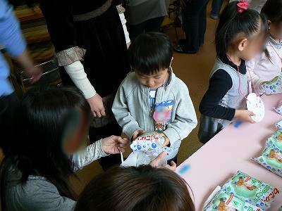2月の話☆この日はハルのお買い物遊びの日親も参加するので楽しみにしていましたぁ。参観日なので最初はいつもの様子を見ることになってて。子供達がお遊戯体操する姿がかわいくって「うんうん」うなづいちゃったよ。そして親がお手伝いしてお店屋さんゴッコ最初はお客さんになってお買い物をするのです。最初にビックリ箱を買いたいと言ってたので買いに行って後は順番に回ってわたがしやオモチャをゲット他にもいろいろ買って~そして食べる!! 買ったものはこんなにいっぱい☆(わたがし&ジュースは食べちゃったぁ) そして今度はハルがお店屋さんになって~人形屋さんになりましたぁエプロンと三角巾をかぶって なりきりさんです♪元気に いらっしゃいませ~ありがとうございました~と言わせ耳元で教えないと だまったままだからさ(^-^;)みんなが買いにきてくれて御礼満員にて終了♪ 親子共々とっても楽しかったです!全部手作りで温かい品物がいっぱいで先生に感謝です☆ あっさっきハルが歌 歌ってました。自分で作詞作曲です♪♪~♪ おれたち3にんでおきなわへ~いえい いえい いえい ♪~♪