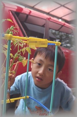 学校でトマトの苗を植えました~。それを夏休み前に学校へ親がとりにいきます~。そのトマトが赤くなって~ハルが撮ってくれと~リクエスト☆ 「すっぱいけど美味しい」とハル食べてました☆ 自分で育てたトマトはさぞかし美味しかったことでしょうねぇ~(^^)そんな喜んでる姿を見れてアタシは幸せです☆