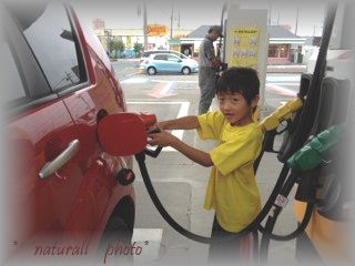 我が家の車のガソリンを~ハルが入れてみました~☆「臭い臭い」というハルしょうがないよねぇ。。よくがんばりました~☆