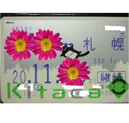 JR北海道の新乗車カードです。IC機能のカードで改札口に翳すざけで改札が出来ます。帰宅時に購入し初めて使いました。改札を通す従来の定期券と違い非常に使いやすいと思いました。この一枚のカードで永久に使用できます。(生きている間)銀行のキャッシュカードを思わせます。写真は花模様でモザイクしておりますが(この方がキレイかも)笑真ん中にモモンガがおります。どういう意図でモモンガなのか分りません。明日でも聞いてみます。