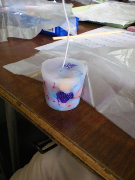 紙コップに、色付きロウを砕いたものや、ビーズ、スパンコールなどを入れ、溶かした白いろうそくをまわりに注ぎ入れて固めます。