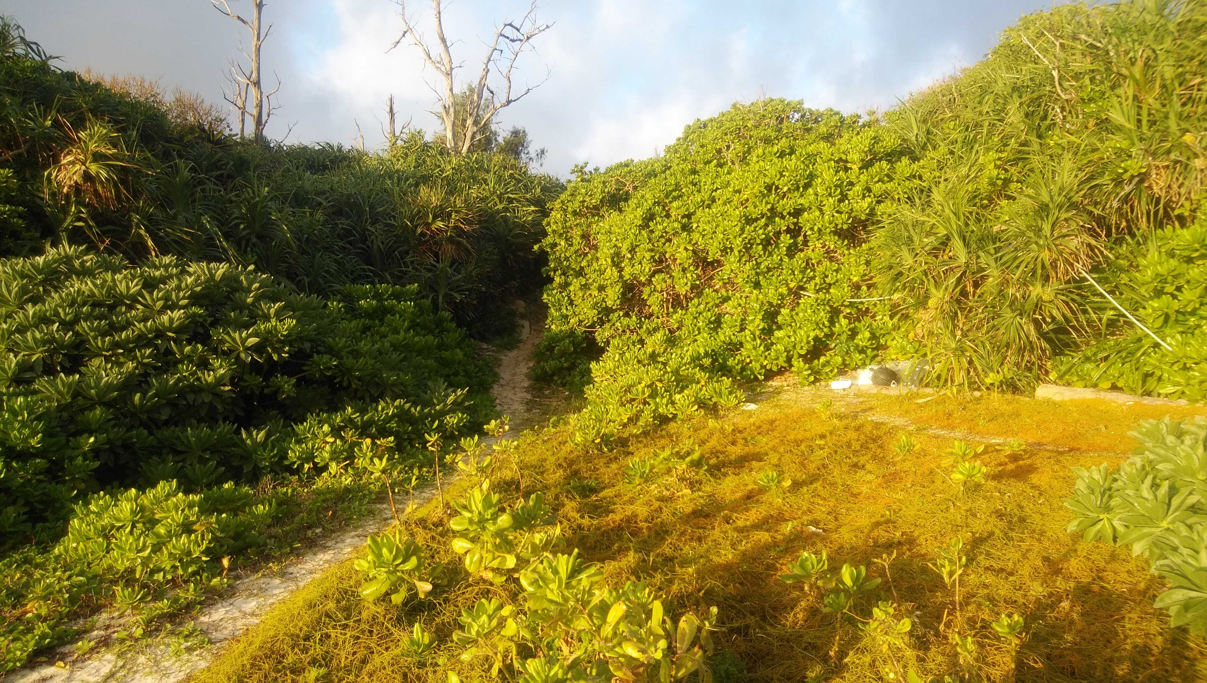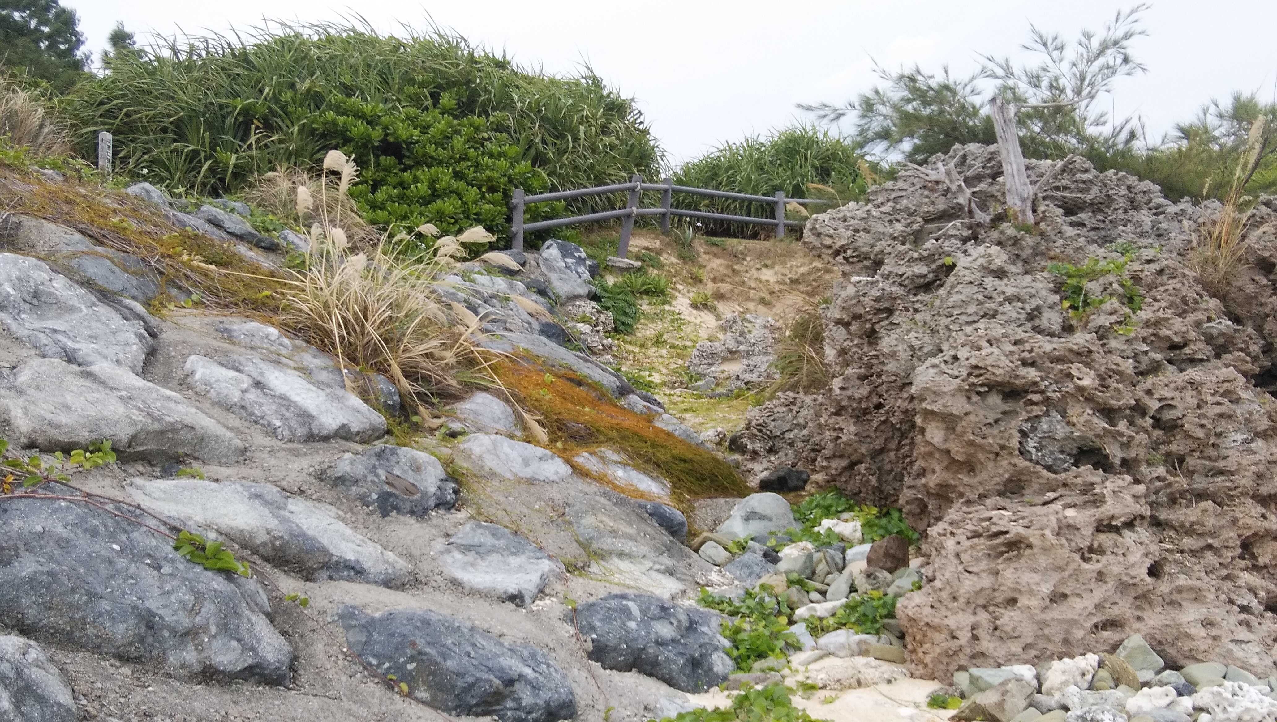 骨折した足のリハビリを兼ねて 船倉海岸を散歩した。 離れ島といつか 砂の道でつながれることを期待しながら その様子を記録しようとしている。 去年と一昨年は 台風が接近してないので砂が海にひきずり落とされていない。 浜が ずいぶんと大きくなってきた。 植えたモンパノキも大きく育っている。 今年は 自然に生えたポンパの木も多く育っている。 間引きをして 鉢上げしたモンパノキを育てているが 海岸の高潮の来ない渚の見極めが 難しいところである。 失敗を繰り返しながら 打ち上げられた流木やサンゴ石で守ってあげる。 アザミなど 浜昼顔など 草トベラは強い 芝が生えてくる。 クロイワザサが広がってきたらさいわいだが ネナシカズラが寄生してしまう。 植物たちの戦う姿を見ていると 自然とは 厳しいものだと 感ずる。 朝日 実は 砂を 撮ったのです。 目線 と 足線 夢を叶えるために 日の出を拝む