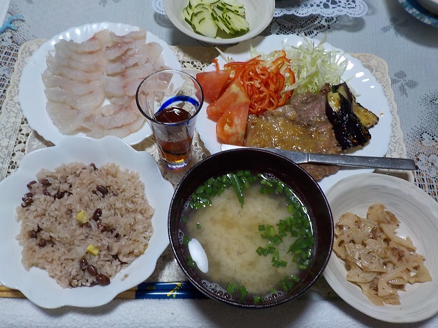 夕食でスズキの刺身と味噌汁が食膳に上った