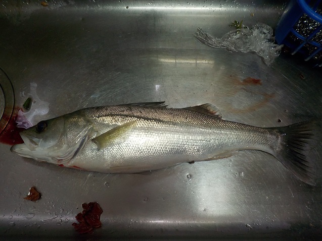 カメラを持参していなかったので、2尾ゲットしたところでカメラに記録しておかないとと思い、釣りたてスズキをバケツに入れ、急きょわが家へ。まずはスズキを活き締めにして写真撮影し計測したら51センチだった。後の調理は家内に託し、カメラ持参で潜水橋へ取って返した。
