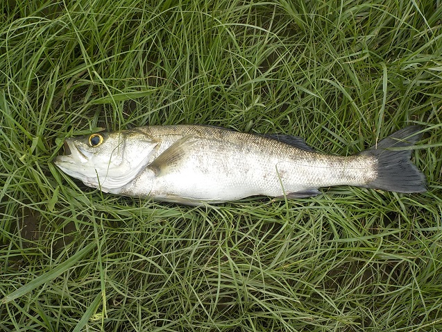 1匹目は30センチくらいのセイゴだった。その5分後に同じ場所でまたヒット・45センチクラスの魚影だったが、20秒くらいでばらしてシマッタ。その5分後くらいに3度目がヒット。今回は2本の針にかかっていたのでたやすく取り込むことができた。ただ、タモを用意していなかったので来合わせていたルアーマンに掬ってもらった。50センチほどのスズキ(フッコクラス)だった。