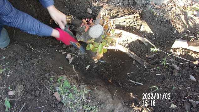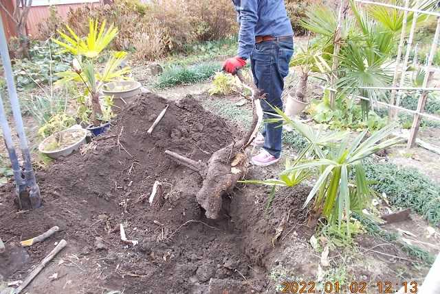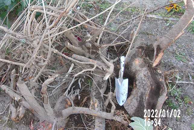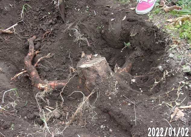 1634,長男夫婦が掘り上げた借用菜園の伐木根株、ご苦労さん