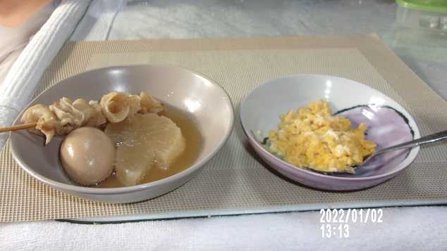 1213、アサヒル一緒のMy食事、おでんとスクランブルエッグ