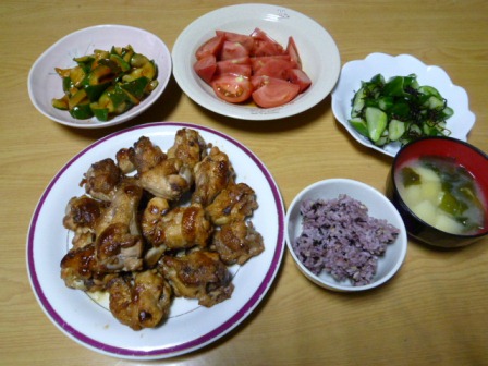 今夜のメニューは、・「鶏手羽元の塩焼き」・「トマト」(ノンオイルドレッシングに浸してあります。)・「キュウリと塩昆布の浅漬け」・「オイキムチ」・「雑穀米と新じゃがのお味噌汁」毎日夏野菜(トマト・キュウリ・ナス)ばかり食べてます鶏手羽元の塩焼き鶏肉は安くって美味しくって、ホントに重宝しますね我が家の冷凍庫には大体、もも肉・胸肉・親鳥の肉、皮・軟骨・手羽元が常備されてます(最近は鳥もつも)手羽元はコリコリ軟骨のところまで食べきっちゃいます☆絶品鶏を堪能!【いい肉屋】九州産▲若鶏手羽元[約1Kg]コラーゲン豊富♪【月間☆家計応援セール!】いまなら5,000円以上のお買物で《送料無料》【訳ありB品】国産鶏 手羽元 2kg 500円《送料別》◆値下げ中◆新鮮鶏肉!健味鳥の朝挽き発送発送日に製造した商品をお届けしています!【香川県産健味鳥】 若鶏手羽元 1kg