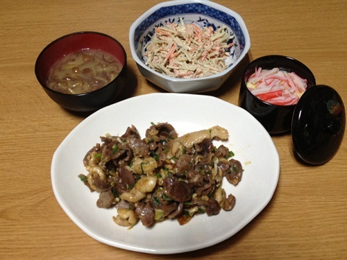 今夜のメニューは、・「砂肝のから揚げ」・「ポテトチーズ焼き」・「ネギ串」・「きんぴらごぼう」クリスマスイブですが、ケーキすらなく、至って普通の夕食です(しかも地味)『うちは仏教だから』と強がり単にお金がないだけなんです地味でもおいしい「ポテトチーズ焼き」と「ネギ串」「ポテトチーズ焼き」は細切りしたじゃがいもに少し小麦粉をまぶしたものをフライパンで焼いて、とろけるチーズを乗せただけ。「ネギ串」も焼いてお醤油で味付けしただけの簡単料理。豪華な料理はすぐに飽きちゃいますけど、こういうのは毎日でも食べれますね(と、また強がり)