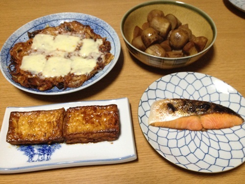 今夜のメニューは、・「鮭の塩焼き」・「厚揚げステーキ」・「じゃがいもチヂミ」・「里芋の煮っ転がし」茶色「厚揚げステーキ」と「じゃがいもチヂミ」厚揚げはバターで焼いて、焼肉のタレで味付けしました。バターと焼肉のタレって合いますね今日のヒットは「じゃがいもチヂミ」先日同じような要領でじゃがいもピザを作りましたが、それにキムチを加えてチヂミ風にしてみました。じゃがいもを細切りにして使うやり方は他にもいろいろできそう研究してみます