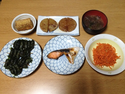 今夜のメニューは、・「鮭カマの塩焼き」・「大根ステーキ」・「にんじんのナムル」・「厚揚げ」・「しそ巻きみそ」・「ふのりのお味噌汁」「大根ステーキ」大根をフライパンで焼いて、お醤油で味付けしただけこれがなかなかイケるんですよこちらは東北土産の「しそ巻きみそ」と「ふのりのお味噌汁」「しそ巻きみそ」はごはんのお友に、お酒の肴にぴったりふのりはネバネバして、いかにも体に良さそうですねなつかし~い♪ふるさとの味くるみごま入りしそ巻きみそ【がんばろう!宮城】【2sp_120314_b】しそ巻きみそ(惣菜製品)3串入り【東北復興_がんばろう!宮城】【RCP1209mara】三陸産 乾燥ふのり10g【2sp_120829_green】【RCP1209mara】ふのり