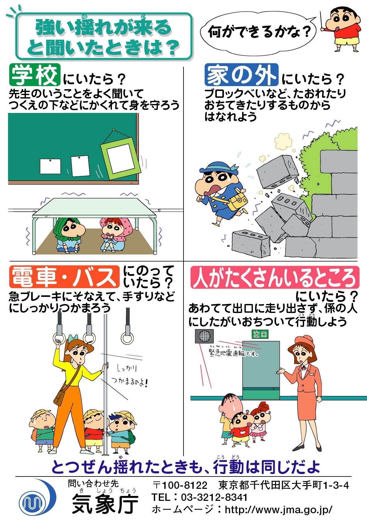 周辺に人がいたら、周りの人にも「頭を守れ、机の下に隠れろ」などの声掛けもしたいものです。