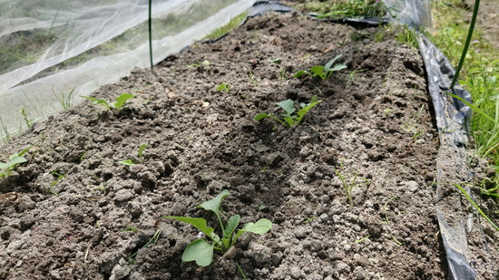 メロン収穫後、耕して寝かせておいた場所に菜花の種まき畝の空いてる場所に中晩生の玉ねぎ種蒔きあとはキャベツ、白菜、レタスに追肥と雑草取り