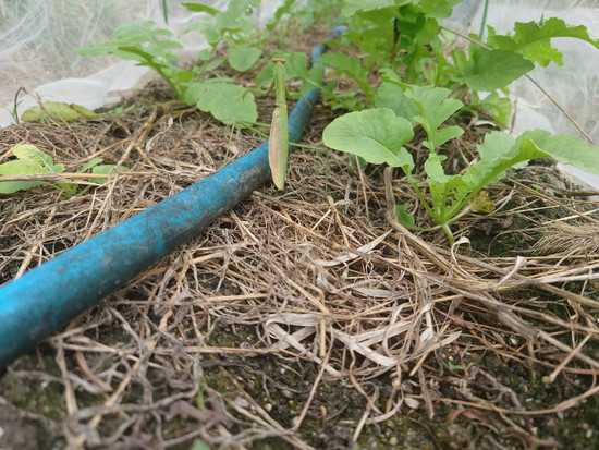カマキリがいたので捕まえて大根・白菜畝に投入効果はどうなんだろう?(笑)ロメインレタスを3株植え付け枯れてなくなった白菜苗を再度植え付け雨後で畝がグズグズなので作業は少しだけ