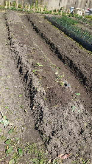 今日は先週掘ったサツマイモ畝もみ殻や乾燥させたシソの木?や色々入れて埋め戻し来年の夏野菜植え付けまで放置先週撒いたほうれん草(3列中の奥)今日は中央にほうれん草、手前に小松菜の種蒔き先週撒いた晩中生玉ねぎ少しずつ発芽中