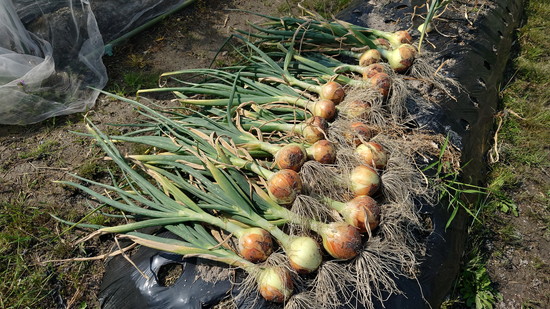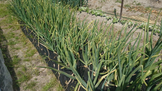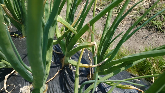いつもの代休の水曜日今日は収穫しようと畑へニンニク株が倒れてきて収穫適期タマネギ中生・晩生でベト病にかかっていたが薬剤散布が効いて、なんとか収穫出来るまで大きくなって良かったジャガイモマルチめくるとヘビの子供2週間ぶりの畑はズッキーニ収穫キュウリも収穫伸び放題で一部脇芽摘心メロンも伸び放題空中栽培の為、伸びた苗を網にくくりつけトウモロコシも大きくなり雄花がそろそろ追肥必要かピーマンシシトウトマト虫食い跡・・・大玉なのにスイカ:伸び放題になっていたので株毎にまとめて向きを揃えて4本残して摘心ソラマメ:一部収穫雑草が伸び放題だったので一部草刈り