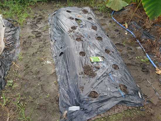 今年は2種類午後1時半から畝の雑草取り石灰、牛糞堆肥、鶏糞、防虫剤を撒いて耕運機で耕して、畝を整えてから畝の左におでん大根、右に冬自慢種蒔き、覆土後は足で踏みつけ最後に散水し、防虫ネットを掛けて終了夏の畝作りから種蒔きはしんどいですね~終了時には靴下まで汗でボトボトでした・・・落花生のおおまさり散水ホースで定期的に散水しているので順調