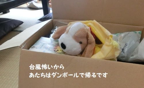 美濃太田の線路沿いの空き地でみつけたアサガオのふたばが庭で咲いています。少し小ぶりだけどとても濃い紫で、結構気に入りました。旅行中3泊したペットホテルで『ガムダメなの』宣言はしていたけどおやつはあげていいからカンちゃんが嬉しい時間にしてもらえたらとお話してあったので、おやつもらったんだろうなぁ。お散歩は少な目だと思うしお迎えに行った時に「本当に食い付きのイイ子ですね~」と報告を受けたところを見ると、フードもしっかりもらってたんだろうけどそれにしてもなんかお腹に詰まってるのか?と心配になるほど、腰回りがデップリとなっていました。この4日で元通りのカンちゃんに戻った気がします。抱っこした感じもずっしりになっていたのが、元に戻ったかな。お天気悪いし、おばあちゃんが来ているお部屋のソファーベッドの下にコッソリもぐりこんでいるところ。(↑)一階 カンちゃん♪ 二階 おばあちゃん♪ の図。雨のやんでる時にはお庭でポン!運動不足解消心がけてポン!ポンと長めのお散歩で調整完了?!かなぁ。母の知人から梨が届きました。箱のステッカーが可愛い♪ 住んでいたことのあるところの地名って、漢字の並び見ただけでもなんか懐かしいなぁ。でっぷりカンちゃんも可愛かったけど抱っこが重くてちょっと大変だったよ↓押してね↓にほんブログ村