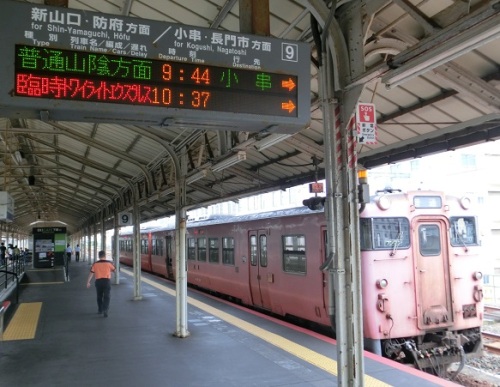 夕飯を食べて、温泉に浸かって・・・・確かにその頃には雨は降って来てはいたけどそうでもなく。翌朝一番に、朝食前に海沿いを歩いて撮影地へ行く予定にしていた兄やんが意気消沈していたくらいで、あまり実感なく就寝。確かに明け方風も強そうで雨も降っていたけど、朝食の頃にはましになりホテルから12時まで部屋にいて良いと配慮していただいていたのでのんびりホテルでお土産を買ったり送る荷物を荷造りしたりして過ごしました。 12時くらいから、運転も再開しそうだというホテルのお話もあったし雨もすっかり上がっていたので、12時前にホテルを出て別府駅へ。運転はまだ再開していなかったので手湯をしたり椅子で座って休憩したりしていましたが、待てど暮らせど状況に変化なしバスが動き出したので、兄やんが大分に移動しておこうと。大分の方が駅自体楽しめそうだし、運転再開した時には大分発の特急だから大分から乗ったほうが確実に座れるって。イヤイヤながら・・・バスで30分。カンちゃん代理の代理でお送りしましょう~♪スタバで休憩したり、改札で頑張って待ったり、お昼を食べてみたり、いろいろいて待ちました。さすがに5時過ぎると、もう運転しないのか・・・と心配になって来ましたが少しでも北へ、東へコマを進めておきたいと思ったので、大分のホテルを考えずとにかく改札で粘りました。テレビ局もだんだん増え、中継も終わり、新聞社が写真を写したり・・・そしてテレビ局ももういなくなったころ運転再開だ~~~~~!!夜7時12分発とあったけど、車両点検などを終えて出発したのは30分過ぎていた頃かなぁ。来るのに要した時間は1時間ちょとだったから8時過ぎには小郡に着くだろう。もう少し遅れたり、新幹線が遅かったりしても、広島の友達のトコまででも帰れればおにぎり作って待っててくれてる!ということになり、ちょっと心強くなって頑張りましたが倒木を線路から撤去したりした直後の特急。徐行運転って半端ない遅さ・・・小郡に着いたのはもう23時だったかなぁ。大分から乗って座れて、本当に良かったと、イヤイヤだったけどバスに乗せてくれた兄やんを褒めたたえました。3時越えで小郡に着いた頃にはもう、私 ヘトヘト。広島までどころか特急内で予約入れたホテルまで歩けるのかどうかの疲労コンパイそれでも隣のホームからプンプン臭うディーゼルの香りと重低音に!!ななつぼしだ~~~~!!一瞬元気を取り戻し 再びグッタリ。24時寸前ホテル着。 夕飯はとうとう食べられず就寝。 やっと帰る日の朝になりました。ホテルの朝食より駅弁が食べたかったので起きただけで駅へ。この子(500系新幹線)を見て元気微増微増しただけだったので、駅弁はあまり食べられず・・・・兄やんがほぼ二つ完食もうお茶しか喉を通らない感じでグミを食べて帰りました。 吹っ飛んで来てくれた!と思ったら、今回もUターンのカンちゃんに会えたら元気増量!でした。 そして日常に戻ったのでした。 カンちゃんとの普通の毎日は、やっぱり良いわ こんな旅行になったけど、ガッカリ感だけでもなかったよ↓押してね↓にほんブログ村