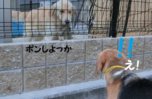 お散歩の道にめっちゃ可愛いゴールデンレトリバーがいます。この頃、私がナデナデとかしているとお家に帰ってポンをもってくるのです。それでも大型犬苦手のカンちゃんは距離取ってる??ゴールデンちゃんが、おもちゃガンバって運びでカンちゃんが目を合わさない。けど↓押してね↓にほんブログ村