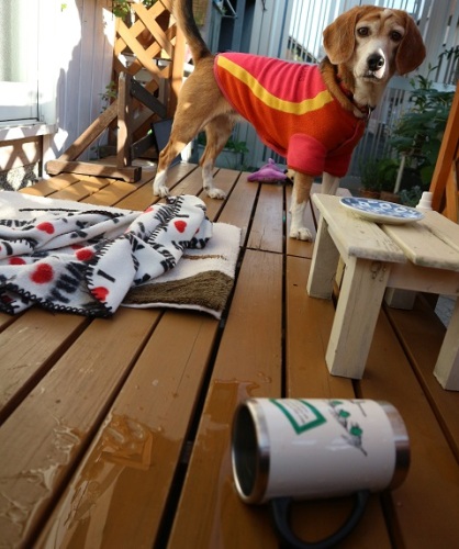 あはは。題名直結画像? +な+に+が+あ+っ+か+と+い+う+と+昨日から明日あったかかったら、時間があったらやろう~と思っていたカンちゃんカフェ。でした。茹でていたサツマイモが残っていたのでホットケーキに入れて焼きました。あ~かんちゃんが喜びそうなおやつです~(甘さ控え目)デッキにあがるとカンちゃん嬉しいんだよね~美味しく頂きました~♪結構平和に♪(〃'∇'〃)もうないのかなぁ~そこにさっきおばあちゃんが庭で落としたホットケーキ登場!おばあちゃんの姿にテンションUPUPになったカンちゃんお利口度一気にダウンそして・・・・こんなことになってもカンちゃん気が付かないしこんなことになってもまだそのまま座って写してる私をおばあちゃん理解不能。「早く拭かなきゃ!」イイノダアキラメはダイジ庭だし、お砂糖も入ってないし。ミラーレスにもかからなかったし♪やっと異変に気が付いたのかなぁ?ウッドデッキから降りて、うろうろになったカンちゃんでした暖かい日にまたやりたいなぁ~カンちゃん良かったねって↓押してね↓にほんブログ村