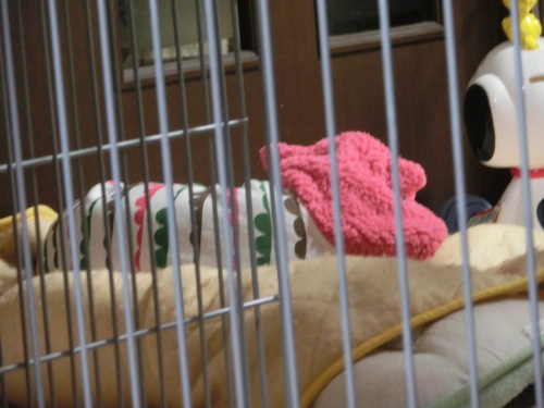 ケージの中にあるのはなんだぁ?このあいだ兄やんがが楽天セールでえらんだフクロウを着たカンちゃんフードがスッポリだよぉ。なんか違う動物みたいになってますお布団カジカジしない子なんだけど、久しぶりにカジカジしていました見てる時だけで、私がいなくなるとやめるんだけどなんだろな。 寒いのでおでんにしました。『創作おでん』みたいなのやりたいなぁとうすあげを開いて、ミンチのタネをのばして巻きすでグルグル巻いたのを作ったらなかなか美味しかったけどそれ以外は普通のおでんになってしまいました。 今日はちょっとあったかかったね~寒いのは苦手だね↓押してね↓にほんブログ村