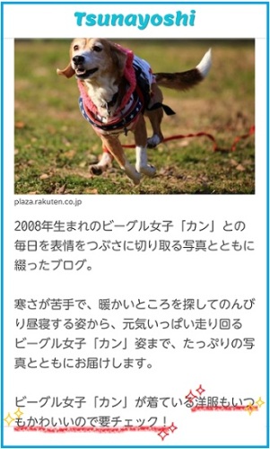 昨日のブログのコメントでなにやらカンちゃんブログが紹介されてる!?なんだろうと見に行ってみたらTsunayoshiというウエブマガジンにこのブログが紹介されていました。 こんな感じ クリックで(そのサイトにジャンプ!)なるほど~のんびりお昼寝。 こういうのですね。車でお昼寝ヌクヌク大好き。そうそう可愛い洋服。それと、元気一杯走り回る!! ね。 コレね。専属カメラマンの兄やんことも一言明記して欲しかったやんかです:::::って・・・・ 笑ってくれるかなぁ~ 安心してください。カンちゃんのお口はちゃんとなってます ほんとは今日載せるつもりだった画像がコレだし。。。。どこが可愛い洋服なのか~~~って自分でも笑ってしまいました。でもこのお洋服はこれで可愛い♪お気にいりになったよ特に、お袖のとこから胸のあたりが萌え~アメリカのお友達が、昨日送ってくれたもので、「悪いコトした時着せてブログで使ってね。」って。 その試着でした♪ウエブサイトに載ったのを誰より喜んだ兄やんが(^m^)表情をつぶさに切り取る写真とかたっぷりの写真とともにという文言にすっかりウキウキして今日は撮影に行ったのでした。新しいもの好きのカンちゃんが「オモチャ持って行くです~」と咥えて出たのでアメリカの犬オモチャ面白いのばっちり咥えて走るとこ!狙ったのですが、さっきの1枚のために写した写真は50枚越え。なかなか口がこっち向くように咥えてくれなくてー。上下さかさまの一枚が奇跡の一枚でした。それにしてもアメリカのオモチャって・・・|* ̄∇ ̄|『ビーグル女子 カン』ってどういうことなん?と問い合わせ2つ。(笑)ミラーレス女子 みたいな今風の言葉?かなぁ。「ビーグル女子 カン! 」 もう2位はならないと思うけど元気が出るブログ頑張ります↓押してね↓にほんブログ村