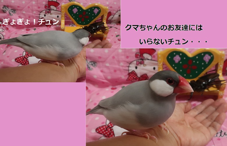 兄やんがクレーンゲームでとってきてくれたお土産です~!ゼリーが入ってるみたい。すみっこぐらしみたいな色合いは怖くないけどこういうのは苦手なくまちゃん キティちゃんにはのぼってくれませんでした。かんちゃんは今朝もあさんぽだけでした。朝いちばんの嬉しい顔100連発です~(うそです。8連発)クワガタ 今日もおらず。 カナブンだけでした。そりゃねぇ夜明け前に行かなきゃですよね。かんちゃんに新しいマットをあげたよ。ネタがなくてかんちゃんの写真ばっかりだったけど笑ってるかんちゃんに今日もどうか今日もポチっとお願いやんかですにほんブログ村こちらもよろしくお願いします文鳥ランキング