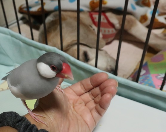 お天気に関係なくカゴから出て遊ぶくまちゃん。常に私を見ています。やっと出してもらえて甘えん坊してくるくまちゃんです。そして こちらの甘えん坊さん今日こそは朝早くお散歩行くぞ!と6時前に出発しましたが途中ですでに雨が・・・・・・しかたなくうちに戻ったかんちゃんです。お耳のお掃除お散歩のあとにしよっかって カンちゃん♬ と思ったら良く寝ていました。起きたらお耳のお掃除をして夕方に雨が上がっていたらもう一回お散歩しようと思っています。起きたので まずは 耳掃除を。そのあと 畑ではちっこっこをしてそのあときゅうりを見つけて♬一本踊り食い!をしたカンちゃんでした。今日はなんとかおさんぽ二回夕方にはちょっと楽しいお散歩でした♬今日もポチっとお願いやんかですにほんブログ村文鳥ランキング