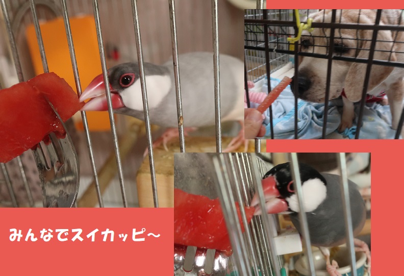 今日も暑かったです。暑いときにはみんなですいかもみんな大好きです。順番にたべました。今朝のあさんぽは6時に近所 1700歩(母ちゃんの万歩計)でした。行こうと思ったらお庭でひしゃくのお水をいっぱいのんで逆くしゃみが始まってしまったのでした。まぁまあ数分で止まって。そこからは軽快な歩きでそのあとはもう暑い暑い。一日何回かお庭に出てうろうろと歩く程度でおしまいでした。お散歩が終わって母ちゃん朝ごはん。かんちゃんは ドッグフードもたべたあとです↑ きゅうり大好きです。今日も梅干しを干しました。今日はにわかあめもなく良く乾いた一日目でした。今日は夕飯のあと 母ちゃんの夕飯も終わったころからカンちゃんぎゃくくしゃみが結構ひどいのが始まって心配しました。ほんとにただのぎゃくくしゃみなのかたまにとても心配になります今日もポチっとお願いやんかですにほんブログ村文鳥ランキング