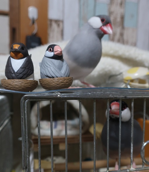 また ガチャガチャで欲しいのと出会ってしまった・・・まちぼうけ鳥 って。つばめと文鳥やん。 インコも出たけどインコも好きなので良いとして。超~可愛い二羽です。今日は雨。あさのトイレタイムは大雨の中行きました。そして 二度寝。 今日は朝6時に起きた時、かんちゃんはもう起きてていつもならお弁当作り始めたらおとなしくしてるのになんか フゥ~ン・・・と鳴いたりなんかして なんやろう。ご飯かな?ご飯あげたら食べましたが ガツガツ!!ってこともなく・・・それでなんかちょっと心配だったけどそのあとはおとなしく寝てたから 良かったかな。と思いつつもガツガツじゃなかったのがちょっと気になった朝でした。雨の中トイレに行ったので 帰って服を着替えて。この服あたたかくて 手は通さなくても着せられるのでいいんだけどちょっと短いのと綿やからもっとあったかい方がいいかと思って 裏にフリース貼ってちょっと長くリフォーム。 結構ゆがんでへたくそだけど あったかくなったかなぁ。そして お昼になって 食べようと思っても寝てるかな。心配・・・と思ったら起きてクレクレ クレクレ~!!そして朝食べたお皿。 もう何も入ってないのに ぺろぺろして♬「母ちゃんは一安心だよ~背中はあったかくね。今日もポチっとお願いやんかですにほんブログ村文鳥ランキング