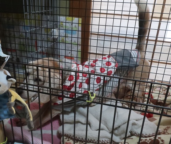 くまちゃんと洗濯ものをたたむのは楽しいです。さて。かんちゃん。歯磨き大嫌い。母ちゃんがカンちゃんゾーンへ入ってやるので母ちゃんがはいってくると すぐにケージの中に逃げ込みます。あまり暴れさせると腰とか怖いので母ちゃんも本気が出せず・・・なので土日には兄やんの協力を♪こんな感じに、かんちゃんをおやつでここに来させます。兄やんは柵の外側でおやつをちらつかせたり母ちゃんに歯磨きシートでごしごしやってもらえたらおやつを一個あげたり。これでなんとか歯磨きシートで歯やはぐきを拭けました。こんな程度でどうか分かりませんが。くしゃみましになってます。 たまたまかなぁ?+++++++++かんちゃん 腰が良くなくなった時服を脱げない日があって。前足を上げられなくて。背中あっためないといけないし困ったなぁとマント型の服を探していたらお友達ビーグルさんのママがお揃いで作ってくれました~!!嬉しいねぇ。オーダーメイドで作ってもらったからぴったりだよ~今朝はちょっと寒さもましだったのでいつものを着て寝てたカンちゃん腰には(キティ)あずき袋チンしたのをはさんでぬくぬくあっためてからトイレにいくですよ~お昼はとーちゃんとおいしいピザを食べに行ってきました。かんちゃんとテラス席の良い季節なのになぁと思うと悲しいですが。 早く帰ってかんちゃんとの時間もたっぷり目。作ってもらったマント式の服。試着したよ~襟もあるんだもんね~すごいね~お腹ベルトは幅がたっぷりあるからお腹あったかいね~寝たまま背中からかぶせて 首を止めて お腹を止めれば お背中ぬくぬくだもんね~お外を歩くときはかんちゃんの自由にあるかせているのでポーズが全然決まらないけど裏はもっとふわふわのあったか生地なんだよ~これで背中冷やさないようにだねって今日もポチっとお願いやんかですにほんブログ村文鳥ランキング