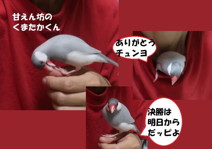 さて。だれのハロウインから載せようかなぁ?くまちゃんかなぁ?と思ったけど 今年はかんちゃんから♪あまり乗り気じゃなさそうだったけど なんかもらえるかな?の一心で一応立ち尽くしていてくれました。あとでりんごをもらったよ。つぎはくまちゃん~♬スタバのハロウインカップに大好物が入ってるもん余裕だっちゅん♪最後は 兄やんが帰ってきてからつばめちゃんもセットのところに置いてもらったよ。 つばめちゃんは何も怖くないみたい。周辺を観察していました。そのわりにピンとあってない・・・・--;今日のかんちゃん。なんと・・・・朝起きると 毛布に血・・・からのスタートでした。お昼前。普通に歩いたりクン活したり のんびりひなたを20分。ただいまやんかです~そして 母ちゃんと くれくれしながらお昼を食べて。またお庭に行きたがったのでお庭に出してお話したりなでなでしたりしていたんですけどカンちゃんカフェにあがったらウッドデッキが滑って・・・ステンステンと。だっこしてしたに降ろしてもなんだか後ろ足が言うこと聞かなくて・・・ステンステンとなって立てないのぉ。ということがあって。母ちゃん撃沈・・・++++++++++++++でもまぁ。そのあとカンちゃんはかあちゃんに抱っこしてもらってうちに戻ってクッションの上でねんねしはじめたので母ちゃんは自分のすることをして夕飯を作って。 ハロウインだもんね~そしたら目を覚ましたカンちゃん。じぃぃぃぃぃ~っと見てました。((´∀`))ケラケラ先にかんちゃんのごはんね。上に乗せたかぼちゃが先に 3秒でなくなりました。飼い主はなんとなく頑張って作った感のあふれたハンバーグみたいなもの。夕飯の前にもカンちゃんもう一度流血。お口の中。歯茎からの出血のようでした。明日先生に診てもらおうね今日もポチっとお願いやんかですにほんブログ村文鳥ランキング
