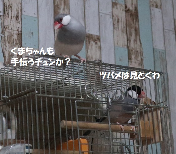 今日は母ちゃん 朝からちょっとお友達と道の駅へお買い物でした。お野菜たっぷり買ってきたよ。うちに帰ってしばらくすると兄やんも帰ってきてツバメに向かって「つばめ どーや?」と兄やんが言うので私が居ない間になにかあったのかと思って焦りましたが。どお?と聞いたのは 体調ではなくて 手前に設置された新しい止まり木のことみたいでした。にいやんに作ってもらった止まり木。いいな。ツバメちゃん。止まり具合をチェックしに来た兄やんと 見守るくまちゃんつばめちゃん 良い止まり木だね。 行動範囲が広がって運動量ふえるかな?++++++++++++++++さて。カンちゃん。今朝も二度寝中に背中にあずきパックでぬくぬくしています。 すごくイイ感じになってるカンちゃんだよ。朝ごはんはこれまた昨日のにいやんのお土産のさつまいもパン。かんちゃんも食べられるからいいね~そして夕飯。ハモのすき焼き風鍋。よってらっしゃいみてらっしゃい!のカンちゃん。それはそれは嬉しそうに。 お皿持ってきて お皿を土台に立ってるの?低いお皿なので良かった。腰に負担はないよね。でも はもをちょびっともらったとたん。 かんちゃん 喜びの舞いだ~~~~~~~~~一緒に食べるの嬉しいカンちゃんに今日もポチっとお願いやんかですにほんブログ村文鳥ランキング