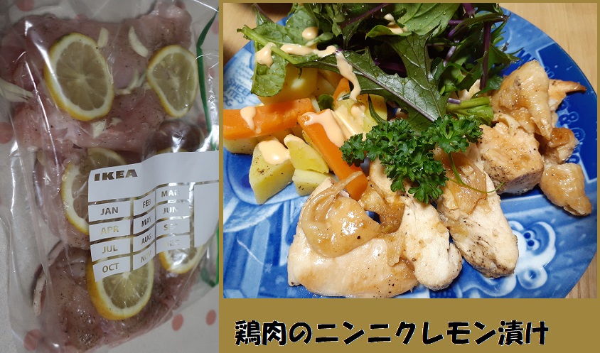 畑のレモンをたくさんいただいたので鶏肉に塩コショウ、にんにく、レモンに一晩漬けておいた鶏肉。