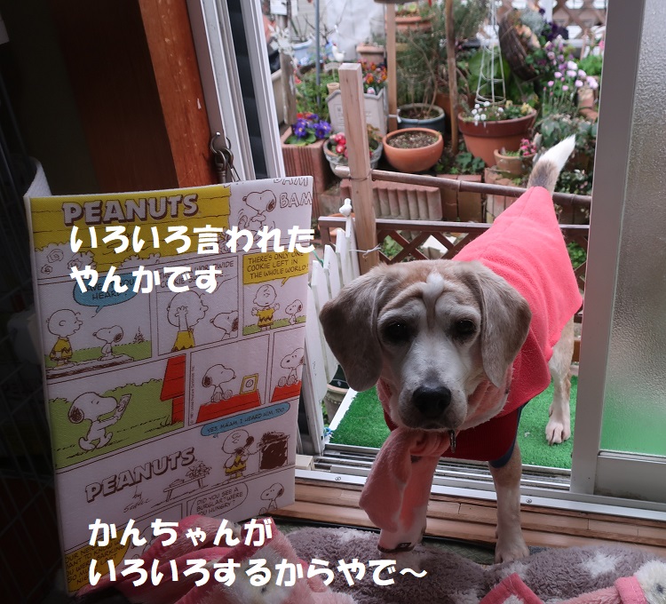 座り込むカンちゃんに 中から「お散歩かぃ~?」「いっといで~」
