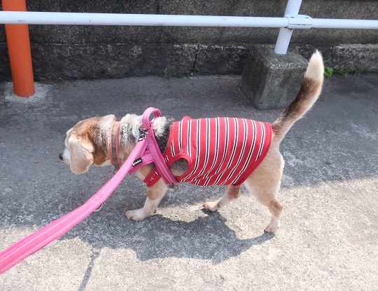 しっぽもピンとなってるけど 近所だからなのか気が乗らないような