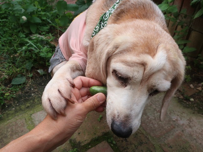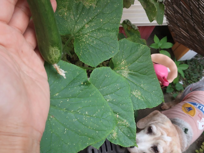 かんちゃんも復活したのでお庭で きゅうり狩り