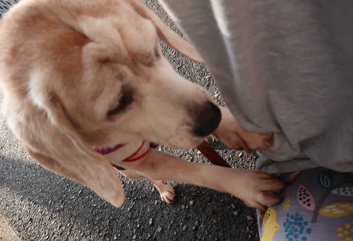 お花を映している私のぽけっとをホリホリするカンちゃん