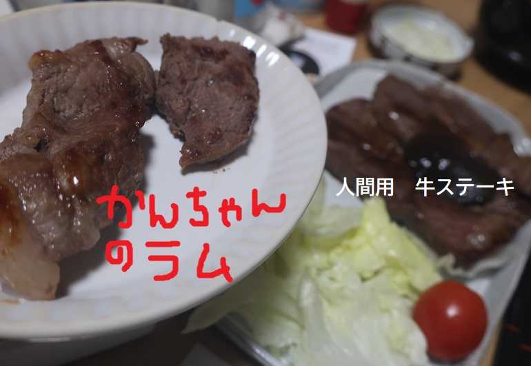 夕飯では かんちゃんにはラムのステーキを買って