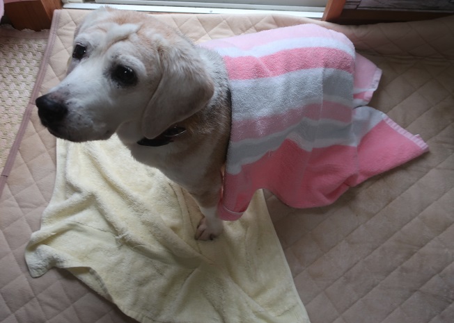うちに戻って足など拭いた後バスタオルをかぶるカンちゃん ↑