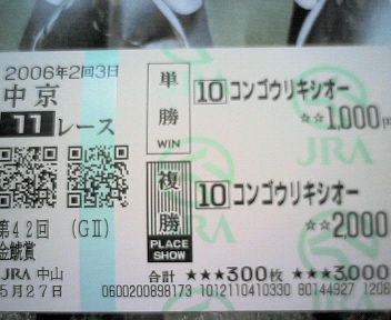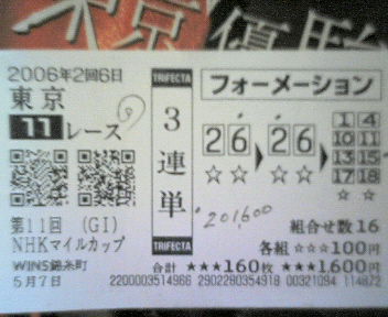 今晩は、今、起きました。今日は、知人の店でボーリング大会があったので午前中に錦糸町のウインズでダービーと目黒記念の馬券を買ってから、午後はずっと外出中。テレビ観戦も出来なかったのでちょっと寂しかったけど、的中出来て良かったです。今回は、ダービーとあって、色々な情報が多かったので、悩みました。囮も多かったので、本当に的中出来て嬉しかったです。今回のゲスト 島谷ひとみさんから、(シ)マタニヒ(トミ)=(シ)バタヨシ(トミ)=(シ)イシロフ(ミ)の二人の騎手を考えて、二人共、しっかり馬券対象着順になってくれて、嬉しかったです。目黒記念が最終レースに組まれて、色々、試行錯誤したけれど、番組上の変更が今回のダービーにヒントがあるならば、昨年の小倉はくぼ競馬を思い出し、小倉デビューの馬のダービー史上初制覇!!読みきれて良かったです。それにポスターのコピー文、過去形よりもその日を未来系に読み取れたので嬉しいです。ポスターから、空のイメージからパスポートも浮かんだし、日本ダービーの『本』と言う字が大きかったし文字が白色だったのも大きなヒントになりました。又、昨日の東京競馬最終レースに石橋守騎手が2枠2番で2着になっていました。枠こそ違え2番に入ったので、今日の練習かなと密かに思っていました。そうそう、こんな事もあるんですね。ダービーよりも嬉しい事!!NHKマイルカップの馬券が出て来たのですよ。ブログに書いて無かったけど、昨日、中山競馬場に行った時、別の財布を持っていったのだけど、その中に何とNHKマイルカップの的中馬券が、あれっ!!これって当たっている!!無意識の内に買っていた見たい。NHKマイルカップは6番2番15番だったけど、今日のダービーの予想の目と似ているなあと思っていたので、それを思い出し、あわてて、パットの残高を確認すると200円あった。気になる馬券は後悔したくないので、2番6番15番だけ、追加して200円買い足した。本当は混戦ダービーだから、単と馬単のスタンスを守り通そうと思ったけど何か閃きが!!おかげで、パットの残高が一気に増えて良かったです。NHKマイルカップの換金は、息子に頼んでおいて正解。午後から、ボーリング大会が有ったので、参加しながら大金を持っているとろくな事がないし、後で、祝勝パーティもあるので今日は、小額馬券。まあ、ボーリングは風邪と怪我をしたので、見学のみだったけど、たまにボーリングも良いなあと。ここしばらく、パソコンの故障とかで、個人的な問題で競馬どころじゃなかったでも、昨日の金鯱賞が的中して気持ちが楽になったのかな?週の初めには、おっかさんに今回のダービーは混戦だし、体調も悪いし、最近不調だし、何か当たる気がしないし、色々、情報が多いし、迷うね♪と談義していていたのが本音。来週は安田記念だけど、すでにコマーシャルが流れて、中居君が結婚式でお祝いの言葉を、花嫁さんのアップもあった。6月の花嫁か!!今日は帰宅してから、疲れて寝てしまったので、さっきテレビでダービーを見たらお天気も良くて観戦した方には良かったですね。本来ならば18頭がゴール番を駆け抜けて欲しかったけど、オークスに続いて、ダービーも一頭、競争中止になったのでそれだけが、残念です。それと、今日5月28日はラッキーが我が家に来て丁度、一年に成りました。もしかして、ラッキーのおかげかな?去年のダービーの当日に来る予定が一日早まって、来た当日は、やっぱり大騒ぎ!!この一年、ラッキーのおかげで、がん検診の結果も少し良くなって来たし嫌な事があってもラッキーの世話をしていると、癒される。ダービーは一生に一度の夢というけど、人生も反映しているのかな?今年のダービーは私にとっても忘れられないダービーだった。石橋騎手2冠おめでとう!メイショウサムソン君頑張ったね!!そして関係者の皆様、おめでとうございます。後は、『無事是名馬』だけを祈ります 目黒記念複勝860円大きいね♪