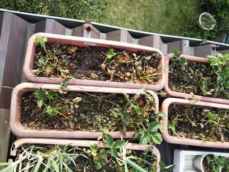 昨日、5月11日の朝久しぶりに屋上菜園に出てみたら・・・・苺が枯れかけている~慌てて水をやったけど・・・もうだめかも・・・屋上菜園、日当たりよすぎるからそれに、風通しもよすぎるから・・・・今週、ウイークデーに一度も水やりしていなかったから(というか屋上菜園に出ていなかった)まだ5月なのになあ昼間ももう一度水やって夕方だいたいなんとか生き返ったこれはもうあきらめようか・・・昨年夏に育苗して、たくさん増えて、収穫目前まで大事にしていたのに・・・やっぱり水やりを怠ったらだめだなああと、今更だけど、藁敷いておこうかな